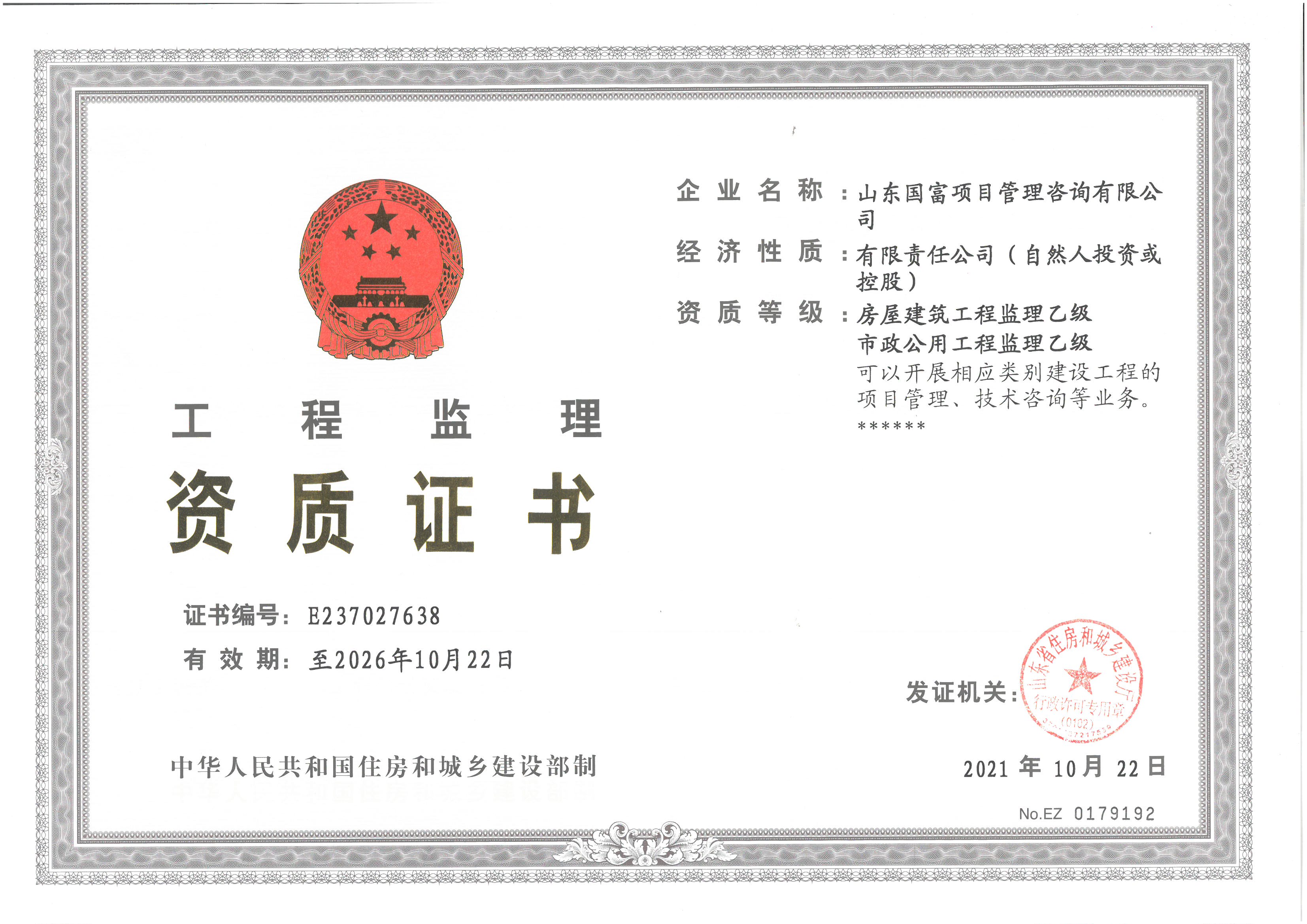 經濟南市行政審批服務局審核通過,山東省住房和城鄉建設廳許可,山東國富獲得工程監理企業乙級資質:房屋建筑工程監理乙級、市政公用工程監理乙級。